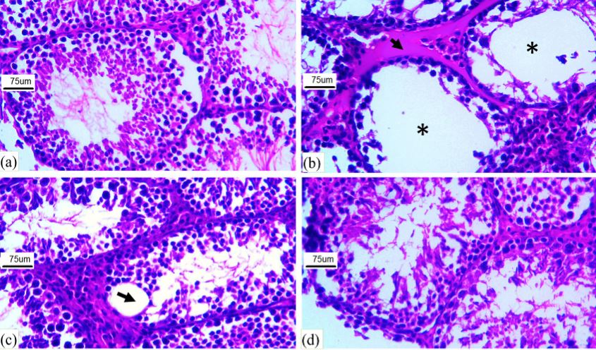 Figure 1. Photomicrograph of Tissue Sections of Testicular Parenchyma in the Control and Carb-treated Groups, Stained with the Hematoxylin-Eosin Method. A, Control group: the regular morphology of the seminiferous tubules with the accumulated lumen of spermatozoa is seen. B, Damaged testicular tissue in the Carb-treated rats with de- creased cell density (stars), especially spermatozoa, detachment of germinal epithelium, and depletion of the in- terstitial tissue edema (black arrows). C, Testis structure in the Carb + CoQ10 group shows partial improvement of testicular tissue toward normal appearance, although there are still bubble-like areas in the thickness of the seminiferous tubules that lack germ cells (black arrows). D, testicular tissue in the CoQ10 group shows normal tissue architecture similar to the control group. (H&E staining, 100×, scale bar = 75 μm).