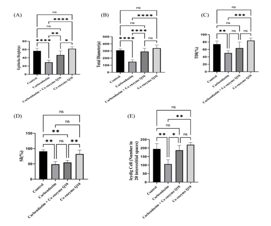 The limitation of this study was that markers related to oxidative stress were not measured. We could measure the total antioxidant capacity and levels of other free radicals in the testes to find the possible mechanism of the negative effect of Carb and the positive effect of CoQ10 on the structure and function of the testis. Another limitation was not testing the spermatozoa in the epididymis of easily euthanized animals to investigate the possible negative effect of Carb and the possible positive effect of CoQ10 on sperm morphology, number, and motility. A third limitation was not testing the testicular structure to look for specific organelles, especially mitochondria, in Carb damage and the possible protective properties of CoQ10.