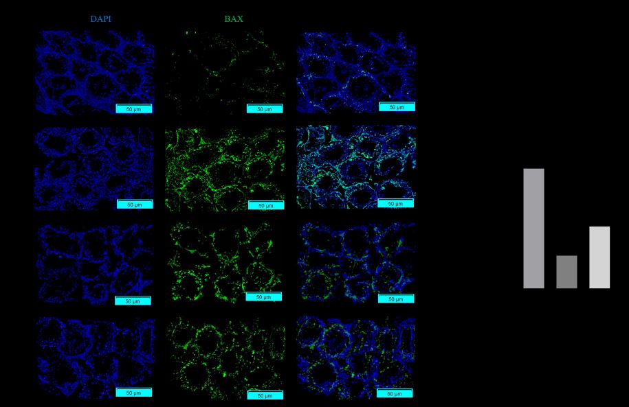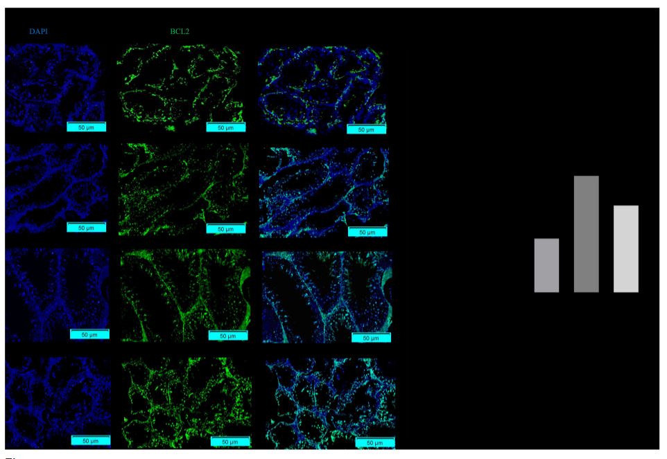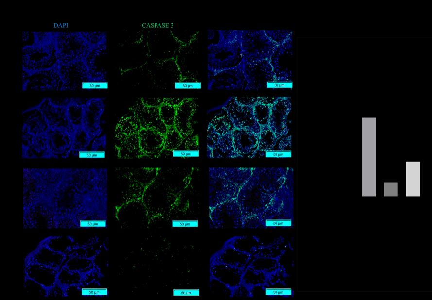 Localization of pro- and anti-apoptotic biomarkers, including Bax, Bcl-2, and Caspase 3 in testicular tissue was done by immunohistochemistry (IHC) according to the manufacturer´s instructions. Antigen retrieval was performed after deparaffinization and rehydration of the testis sections, followed by washing with PBS. In the subsequent step, to inhibit endogenous peroxidase activity, the slides were immersed in a 5% bovine serum albumin (BSA) solution and incubated in 3% H2O2. Following this, anti-Bcl-2 (dilution, 1:100; Santa Cruz Biotechnology, Inc.), anti-Bax (dilution, 1:100; Santa Cruz Biotechnology, Inc.), and anti-Caspase3 (dilution, 1:100; Santa Cruz Biotechnology, Inc.) antibodies were used as the primary antibody. On the next step, Goat Anti-Rabbit IgG (dilution, 1:100) (FITC conjugated; Elabscience Biotechnology Inc.) as the secondary antibody (60 min incubation at ambient temperature). Subsequently, the tissue slices were developed utilizing diaminobenzidine and counterstained with hematoxylin. They underwent a series of processes, including dehydration, clarification, and mounting, before examination with a light microscope (KoreaTek). Following the application of Antifade Mounting Medium containing DAPI (Beyotime, China) at 4°C for a duration of 10 minutes, the positive signals were visualized using a fluorescent microscope (Olympus BX50, Japan). Image J software and Microbin Z5 camera (Media Cybernetics, Inc.) were used to take and analyze immunohistochemistry images. For each tissue section, ten representative microscopic fields were selected randomly. A semi-quantitative analysis on apoptosis-related proteins immunoreactivity score (green for FITC-conjugated antibodies) was then assigned based on the percentage of the protein-positive area compared to the normal control rats.