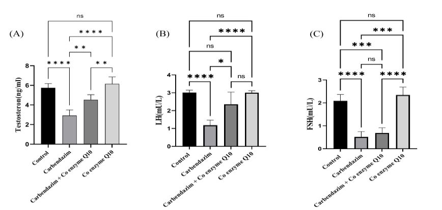 Despite the information mentioned above, the current literature on the possible protective role and the mechanisms of CoQ10 supplementation against adverse reproductive effects caused by Carb is limited. Therefore, our objective was to examine the possible effect and mechanism of CoQ10 on Carb-induced testicular apoptosis, hormonal dysfunction, and the expression patterns of miR-202-5p.