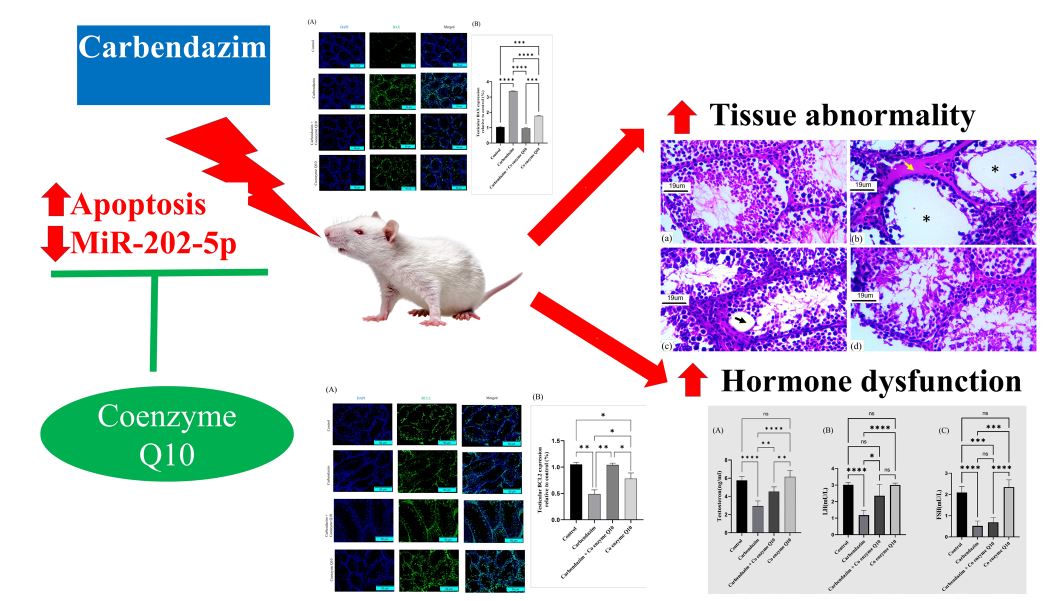 Environmental pollutants are considered the most hazardous problems worldwide. The excessive use of agricultural fungicides is one of the principal causes of environmental pollution. Generally, fungicides are widely used in agriculture to enhance crop growth and yield by controlling fungal diseases[1]. Carbendazim (Carb: methyl-2-benzimidazole carbamate) is a highly effective benzimidazole fungicide against a wide range of fungi and is widely used throughout the world [1-3]. Meanwhile, the Carb could enter into human or animal bodies through skin absorption, as well as food or drinking water contamination [1]. Also, this substance is often transported through rain to food and water sources and seriously harms human and animal health [4,5]. Therefore, Carb is one of the most widespread environmental contaminants of major concern to human and animal health [6]. Currently, the Carb has been recognized as a testicular toxicant in male rats [3]. Also, the Carb could induce male reproductive toxicity in different model animals [1,3,7]. Carb has also been confirmed to interfere with hematopoiesis and metabolism, and induce chromosomal abnormalities by damaging DNA in various tissues [8]. Accordingly, exposure to Carb leads to testicular tissue abnormality and, consequently, impaired spermatogenesis. Consequently, these effects lead to testicular tissue disorders and reduced fertility in male rats [3,9-12]. An increase in the incidence of testicular germ cell apoptosis is a commonly reported occurrence after Carb exposure [13]. Also, according to previous studies, exposure to Carb adversely affects the testes, resulting in suppression of steroidogenesis, induction of oxidative stress, and apoptosis in rats' testes [14-15], which consequently leads to degeneration of germinal tubules and loss of spermatogenic cells.