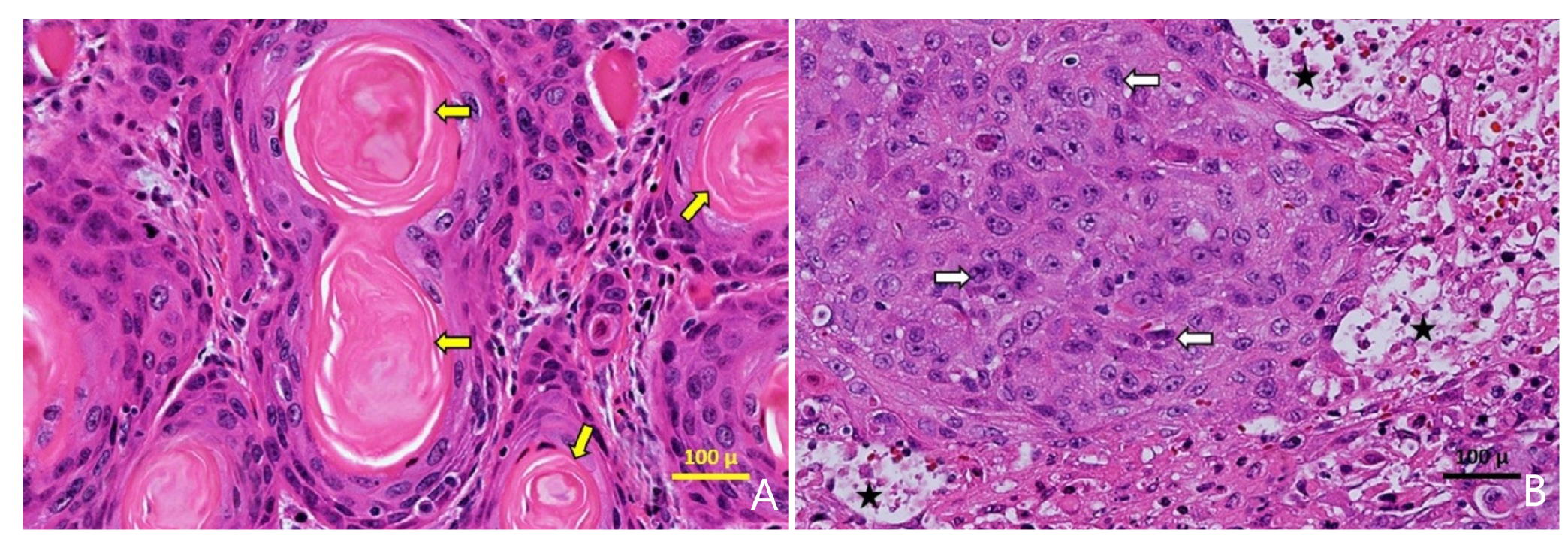 Figure 2. Histopathological images, (A)clusters of well differentiated malignant squamous epithelial cells showing progression from peripheral basal like cells through stratified squamous epithelium with keratinization forming a central keratin pearl (yellow arrow) - H&E stain, 40X objective. (B) Tumour cells (white arrow) with mitotic figures and pleomorphism, areas of necrosis (*) characterized by loss of structure and replacement with eosinophilic (pink) proteinaceous material and cellular debris - H&E stain, 40X objective.